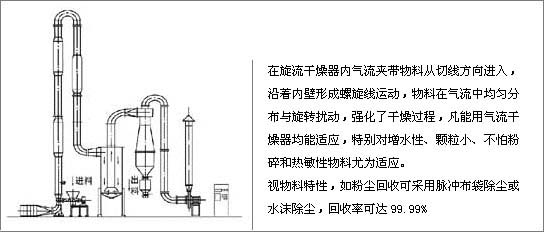 ▲干燥強度大、設備投資省、蒸發能力大,可從50kg/h~2000kg/h; ▲干燥時間短,適用于熱敏性物料,成品不與外界接觸,無污染,質量好; ▲設備成套提供,熱源可選擇蒸汽加熱或配套使用燃煤、燃油、燃氣熱風爐等。 ▲基本型氣流干燥設備,適用于松散狀、粘性小、成品為顆粒及粉末的物料。此流程示意為負壓氣流干燥,用戶可根據產品特性選擇正壓形式的干燥方法。 工作原理 ![]()
